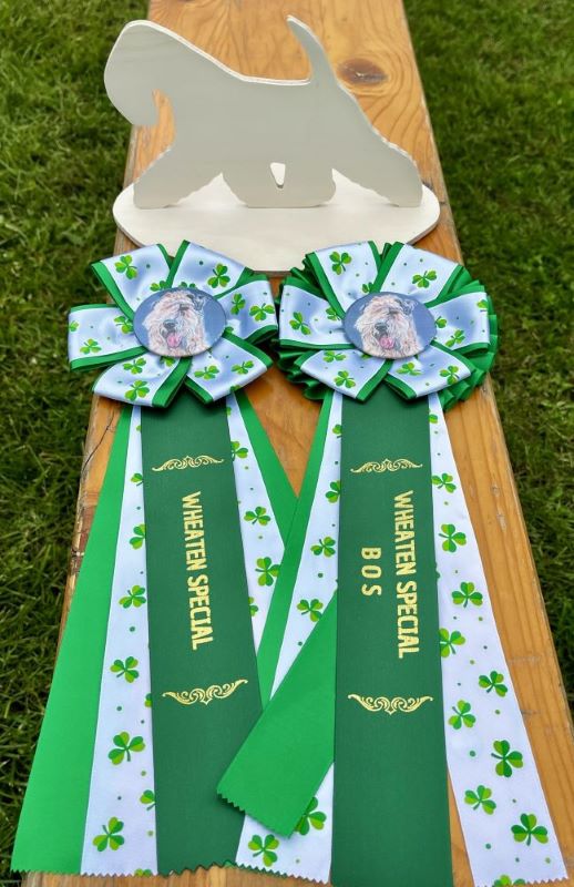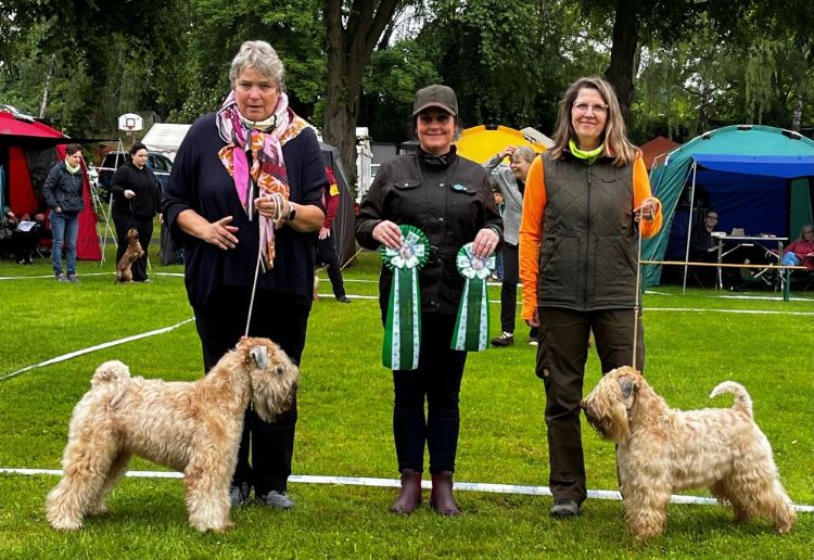 Die Meldezahl bei den Irish Soft Coated Wheaten Terriern war an beiden Tagen leider sehr gering. Von sieben gemeldeten ISCWT waren nur sechs Wheaten anwesend, was ziemlich enttäuschend war. Die Bewertungen der Richterin waren durchweg Vorzüglich. Das BOB wurde an „Viite vom Diekhof“ verliehen, das BOS ging an „Crazy Dogs of Nahe Valley Eleyne“ und Bester Veteran wurde „Viella von der Flurau“. Alle Teilnehmer freuten sich über handgemachte Holz-Wheatens und passende Schleifen für das Irish Special.